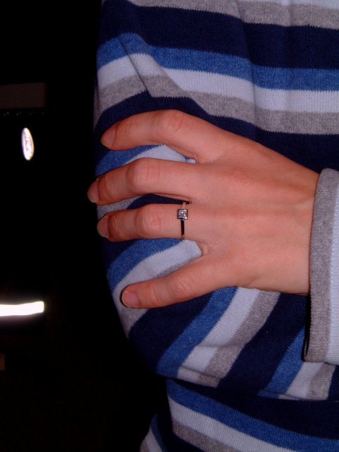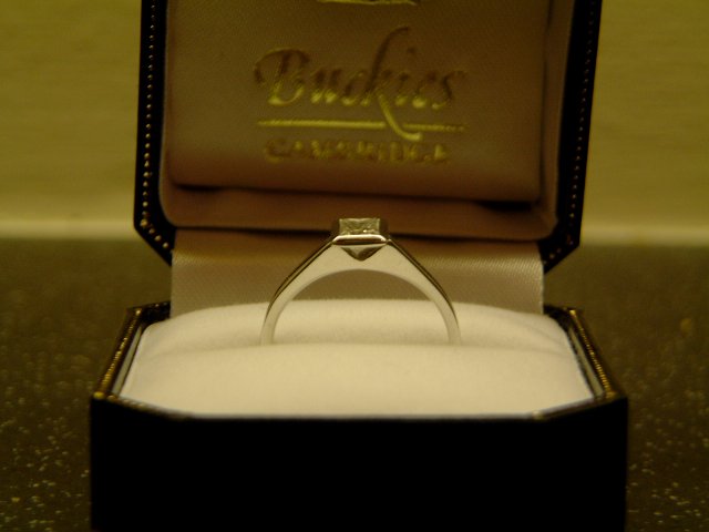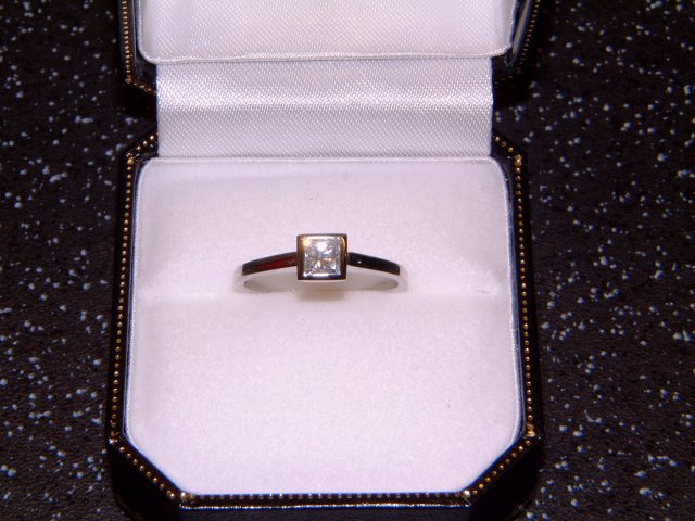 It was a 9.15am start at the shops in Cambridge. 5-or-so hours later (including 30 minutes lunch break) and the choice had been whittled down to two. In two different shops. 10 minutes walk apart. Choice 1 Three diamonds (0.18crt and 2x0.07crt) set in a single width rounded-edge platinum band. Hand made. One of only 50. Choice 2 Single 0.33crt square princess diamond set in a single width squared white gold band. After a lot of thought and discussion (helped along by some (soft) drinks in a pub) it came down to the fact that, although the first choice was a beautiful ring (every ring brought out of the display cabinet was "beau-diful" or "gorgeous", according to the bloke in the shop, but this one was indeed beautiful) and it was, freakily, the right size, the second choice just shouted "Engagement ring". The first choice looked more like a dressy ring. "But white gold? Why? You'll have to get it replated every six months!" Ah, now here's the thing. We didn't want the 2nd choice in white gold, we wanted it in platinum. The nice woman in the jewelers made a few phone calls, and they said they could get someone to copy the design in platinum for us. For an additional fee, of course. "What the heck!", I said, "Go for it." A total of 7 hours of shopping, and here is the result. Click on the image to see an enlarged version.