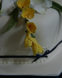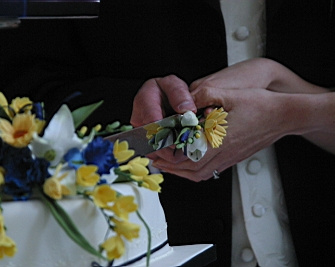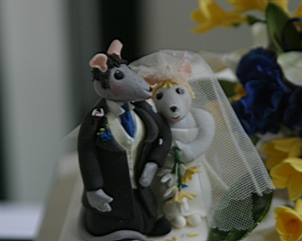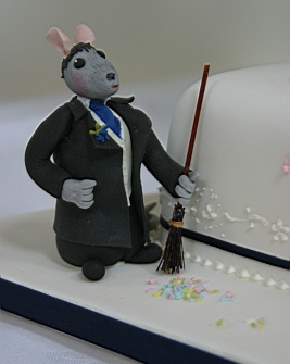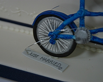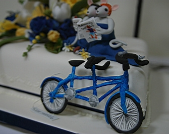 flowers/items for various cakes. She was therefore the natural choice when it came to the cake.The original idea was to have a simple three-tiered cake with some simple flowers. I had seen my mum make sugarcraft mice for the bride and groom figurines on a previous wedding cake, which I thought was a nice idea. Katherine thought so too, so we asked my mum to do the same for us. I can't remember if we were that bothered about the shape of the tiers, but I do know that we wanted to the tiers to be offset from one another. I think it was my mum's idea that the tiers should be diamond-shaped. What actually happened with the rest of the cake is largely down to the wedding crew as they were over the same weekend as my parents. Whilst Katherine, me and my mum discussed the cake in the dining room, the wedding crew were in the living room. When it came to the discussion about the figurines, the wedding crew were more than happy to chip in their own suggestions, which mainly involved them all having their own figurine on the cake doing some sort of action. Surprisingly enough, my mum was up for the challenge, so it was figurines all round! If you notice, they're wearing the right clothes and even have the correct hair colour. Now that's attention to detail! Oh, and then there was the tandem. You see we bought a tandem about a month before the wedding. I'm not sure whos idea it actually was to have a tandem on the cake, but I think it worked great. I think my mum was not too impressed, though, as it was a nightmare, apparantly (I'm told the handlebars were the worst part). I think she did a great job, and the "Just Married" attachment was a great finishing touch. "So what are the figurines actually doing?", I hear you ask. Funny you should say, I was just about to come to that. The story (for which you can thank my mum) goes a little something like this: